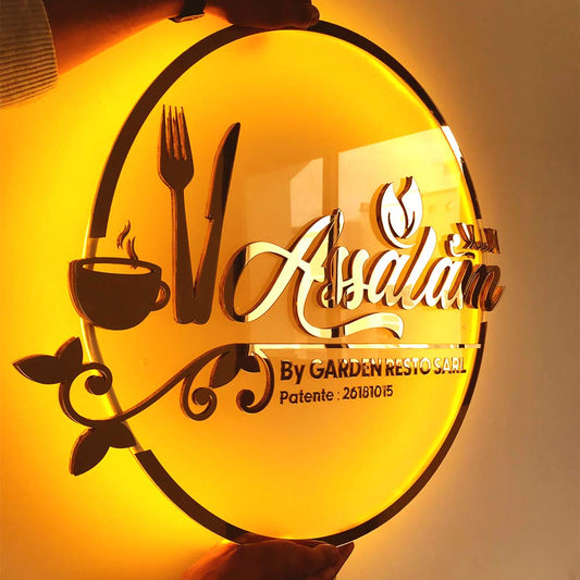 Enseigne acrylique dorée rétroéclairée personnalisée au Maroc